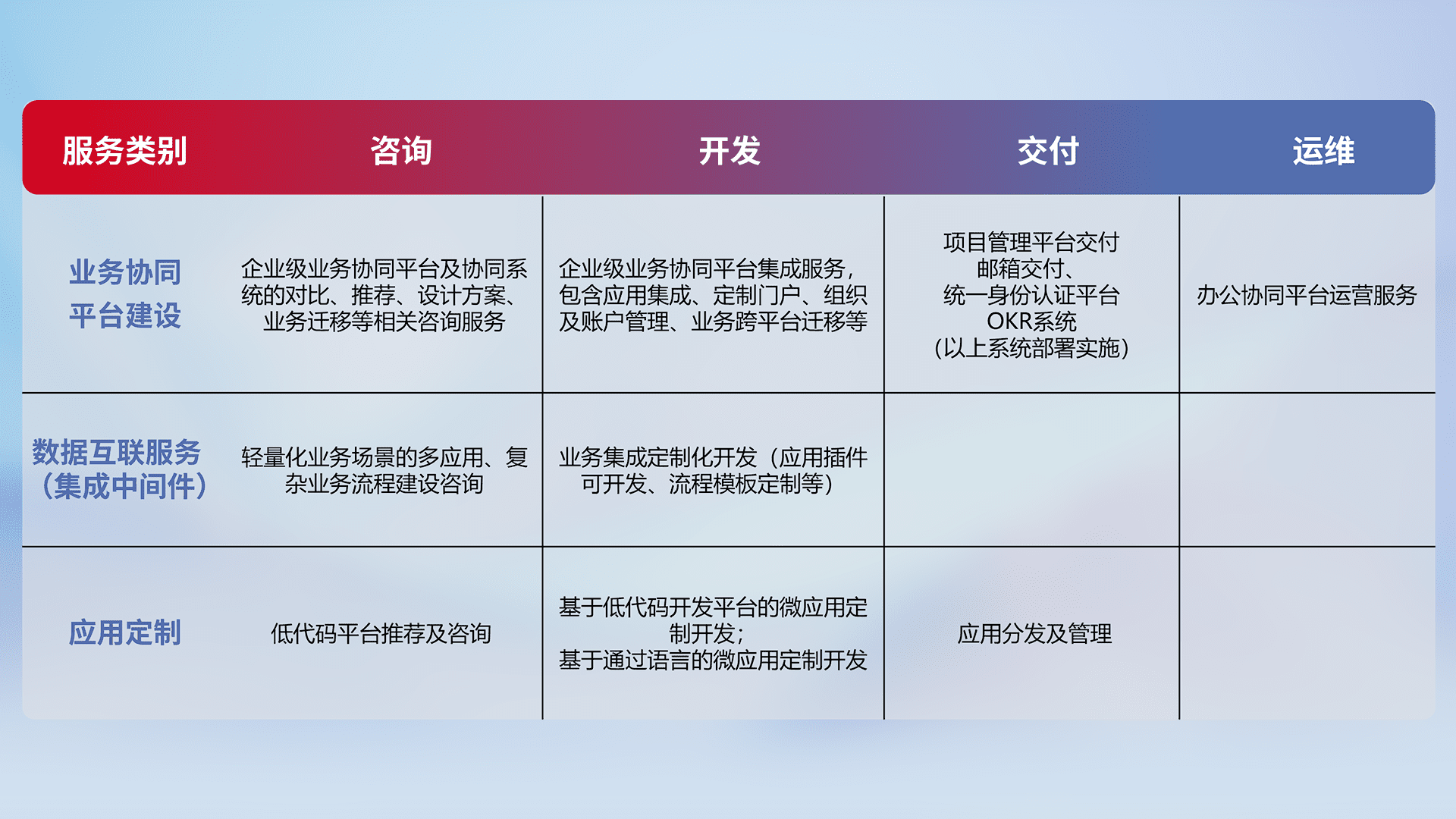 针对钉钉、、、、企微、、IDaas等平台级产品提供产品的规划、、、、方案、、交付、、、、定制化开发等服务,,实现如统一协同办公、、、、智能客户服务、、混合会议管理、、智能数据查询、、、等业务场景,,实现数字化转型。。。。